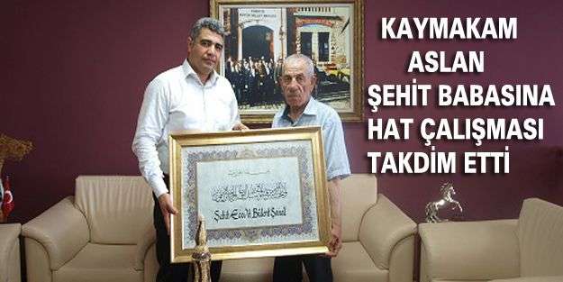 Kaymakam Aslan, şehit Ecevit Bülent Şanal’ın babası Mehmet Şanal’a şehit için hazırlanan hat çalışmasını takdim etti.