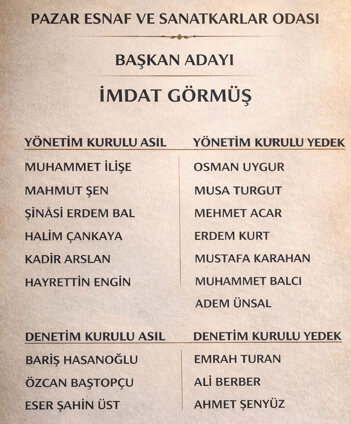İki listeyle girilen Pazar Esnaf ve Sanatkârlar Odası Olağan Genel kurulunda yeni başkan İmdat Görmüş oldu.