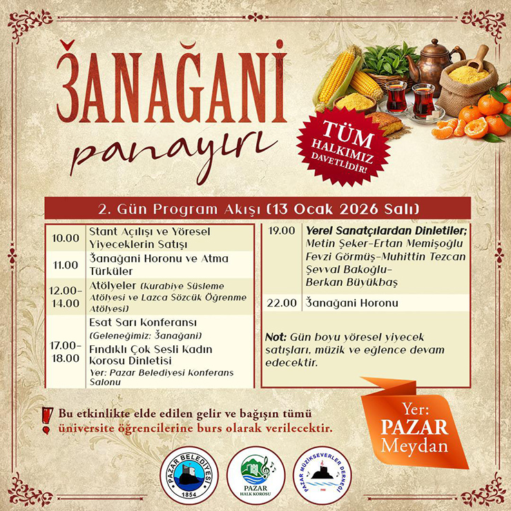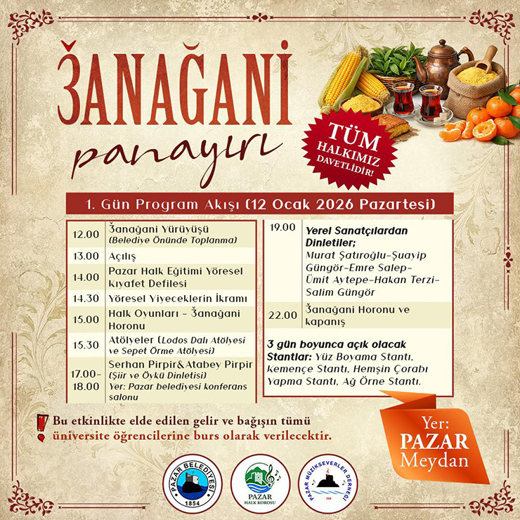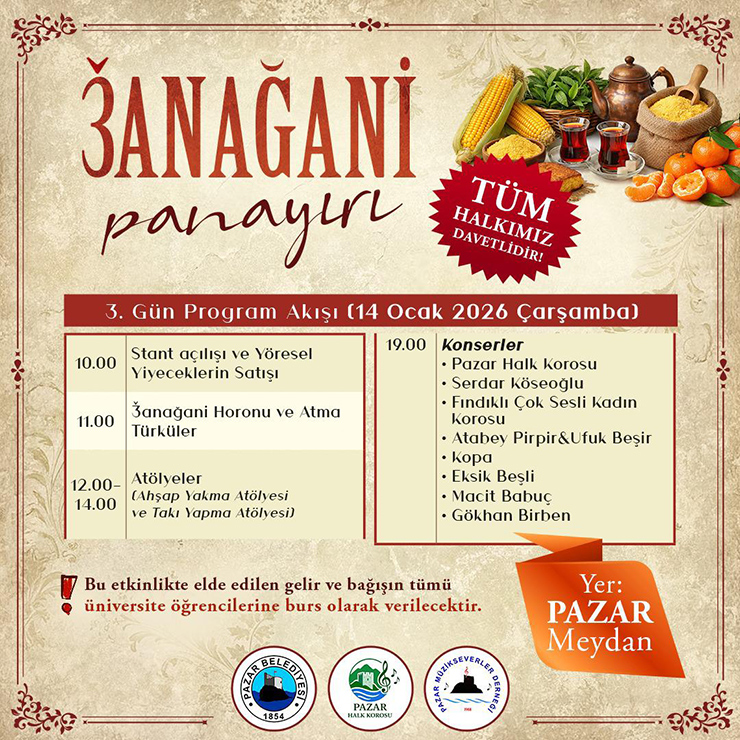 Pazar’da İlçe Belediyesi, Pazar Halk Korosu ve Pazar Müzikseverler Derneği iş birliğiyle düzenlenen 3Anağani Panayırı (Geleneksel eski yılbaşı eğlencesi) organizasyonuna tüm vatandaşlar davet edildi.