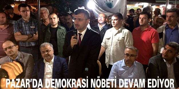 “15 Temmuz 2016 Akşamı Türk Silahlı Kuvvetleri içinde örgütlenmiş FETÖ /PDY üyesi bir cuntanın Türkiye Cumhuriyeti Anayasası ile belirlinmiş demokratik devleti ortadan kaldırmak ve vatandaşların iradesi ile seçilmiş meşru hükümetini görevden uzaklaştırmaya dönük kalkışma girişimi yüce milletimizin ortaya koyduğu irade ve başta Cumhurbaşkanımız Sn. Recep Tayyip Erdoğan olmak üzere Hükümetin ve tüm devlet kurumlarının dirayeti ve direnci ile püskürtülerek, kalkışma akamete uğratılmıştır. Cumhurbaşkanı Erdoğan’nın çağrısı ile daha ilk günden yüce milletimiz, cennet yurdumuz Türkiye’nin her köşesinde meydanlarda demokrasi nöbeti tutmaya başlamıştır. İlçemiz Pazar’da da şehir meydanında Kaymakamlığımız, Belediye Başkanlığımız ve İlçemizde Teşkilatları bulunan siyası partilerimiz öncülüğünde, Pazar’da kurulu bulunan STK’ ların da desteği ile demokrasi nöbeti kesintisiz şekilde devam etmektedir. Özellikle akşam saatlerinde gecenin ilerleyen saatlerine kadar Pazar Halkının her kesiminden ve her yaşından vatandaşlarımızın çok yoğun teveccüh gösterdiği demokrasi nöbetimize ilçemiz dışından gelen misafirlerimizin moral ve desteği ile ilk günkü heyecanla devam edilmektedir.”