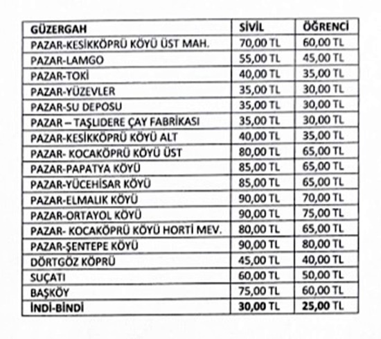 Rize’nin Pazar ilçesinde minibüs ulaşım ücretlerine ilişkin yeni fiyat tarifesi güncellendi.
