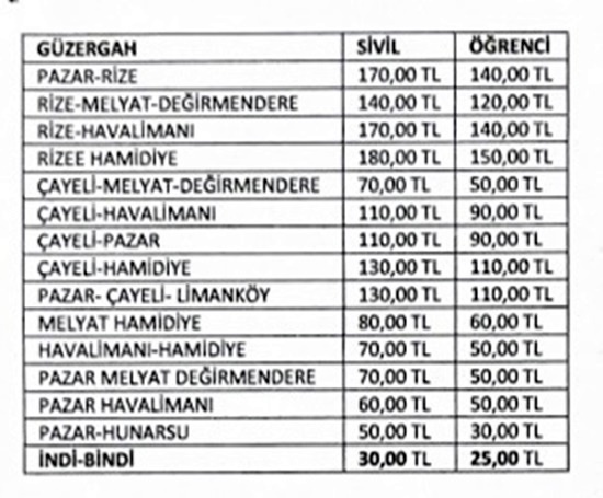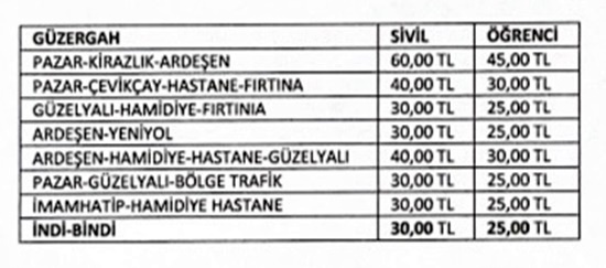 Rize–Havalimanı hattında da aynı ücretler uygulanırken, Rize–Hamidiye hattında sivil ücret 180 TL, öğrenci ücreti ise 150 TL oldu.