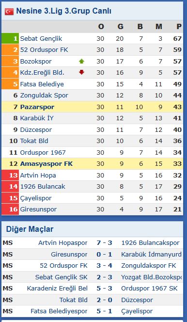 Nesine 3. Lig 3. Grup 30’uncu haftasında Pazarspor evinde ağırladığı Amasyaspor’u 1-0 mağlup etti.