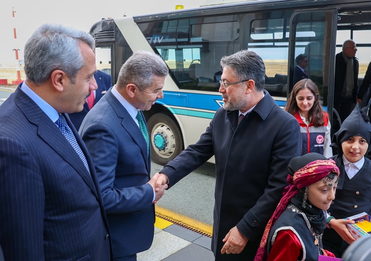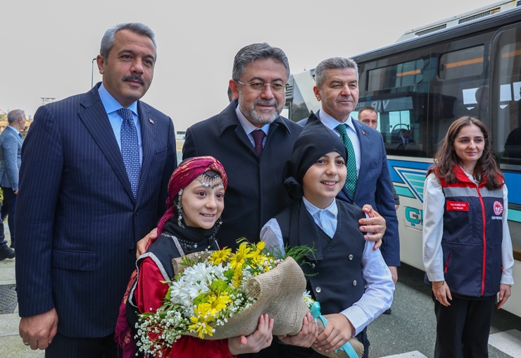 Karşılama sırasında Pazar Ahmet Mesut Yılmaz İlkokulu 4/A öğrencileri Hira Kalyoncu ile Ali Aras Aydil Bakan Yumaklı’ya çiçek takdim etti.
